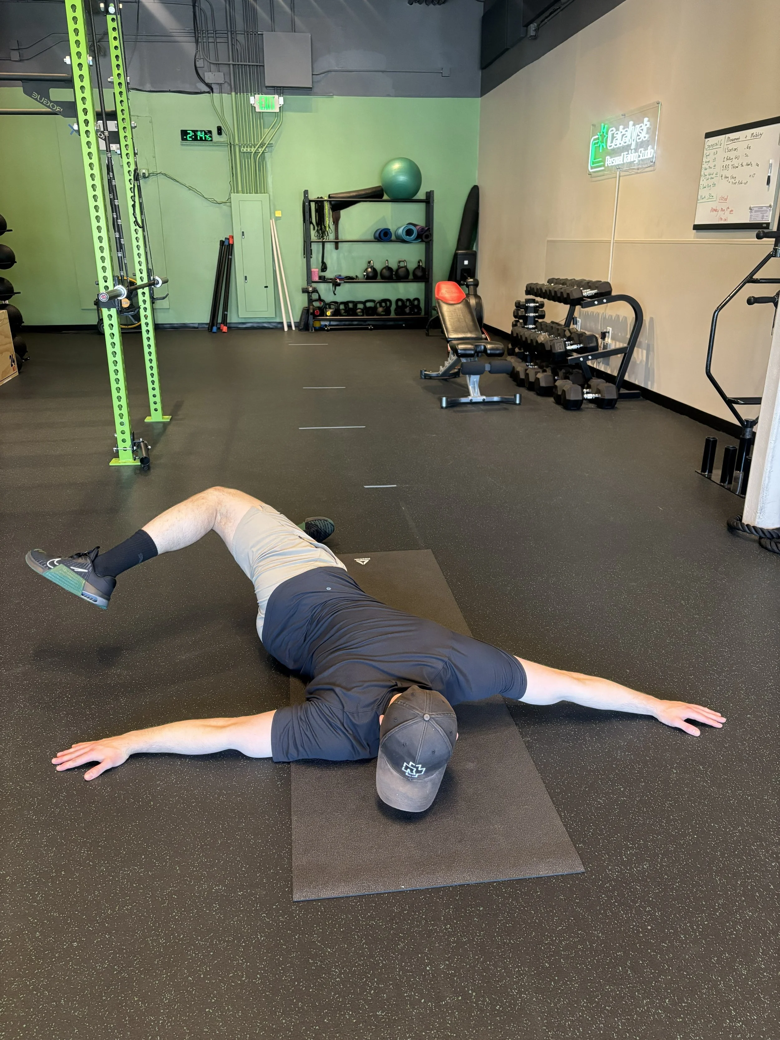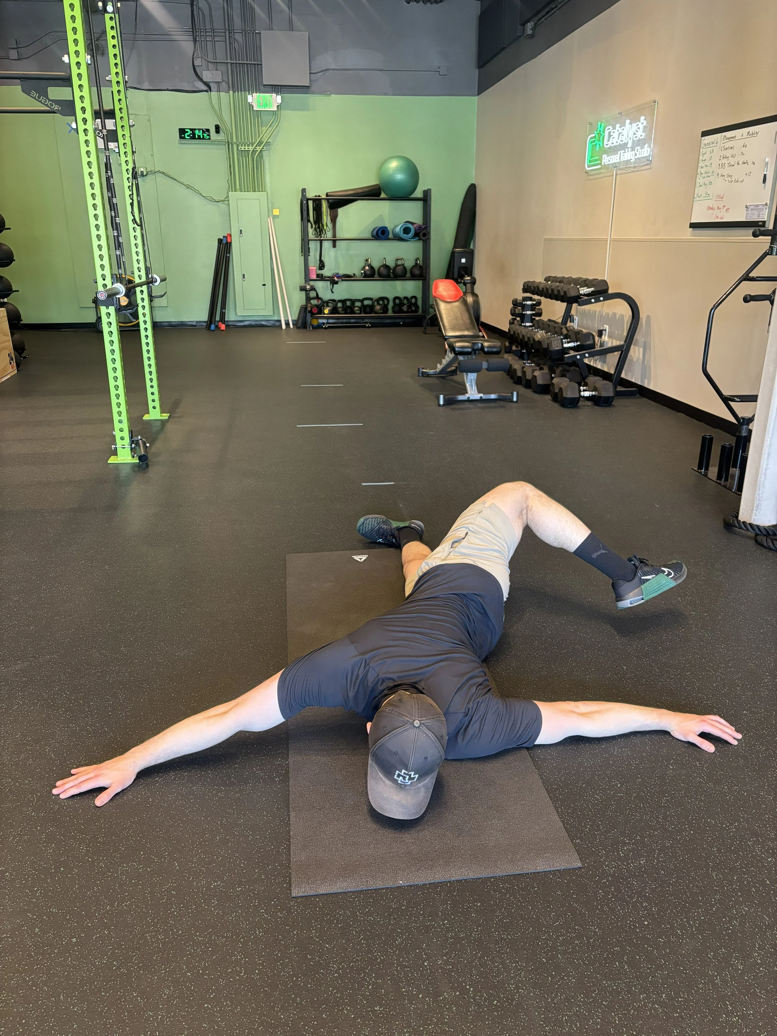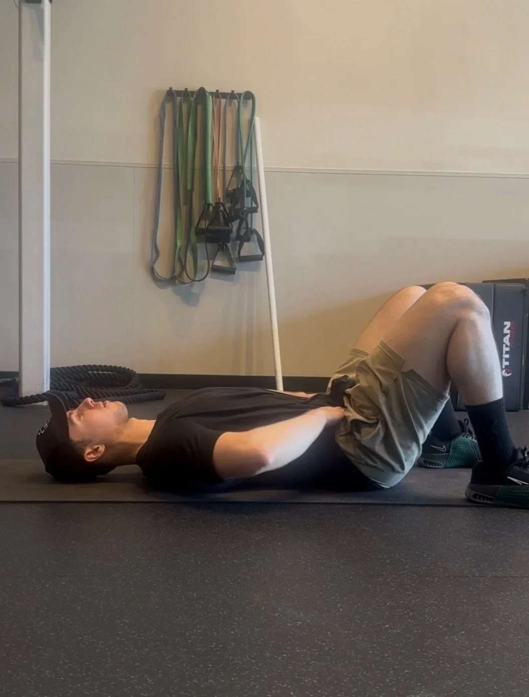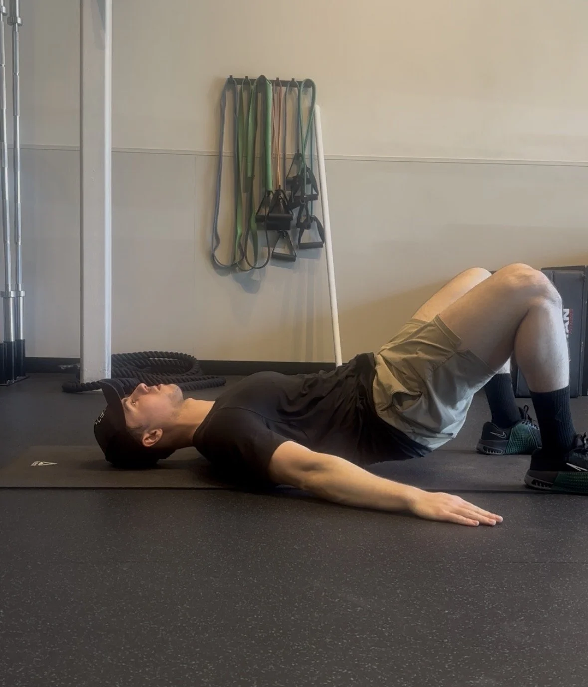 Start by laying on the floor and ensuring your lumbar spine is totally flat to the ground. Activate the core by bringing the ribs down and into the body
