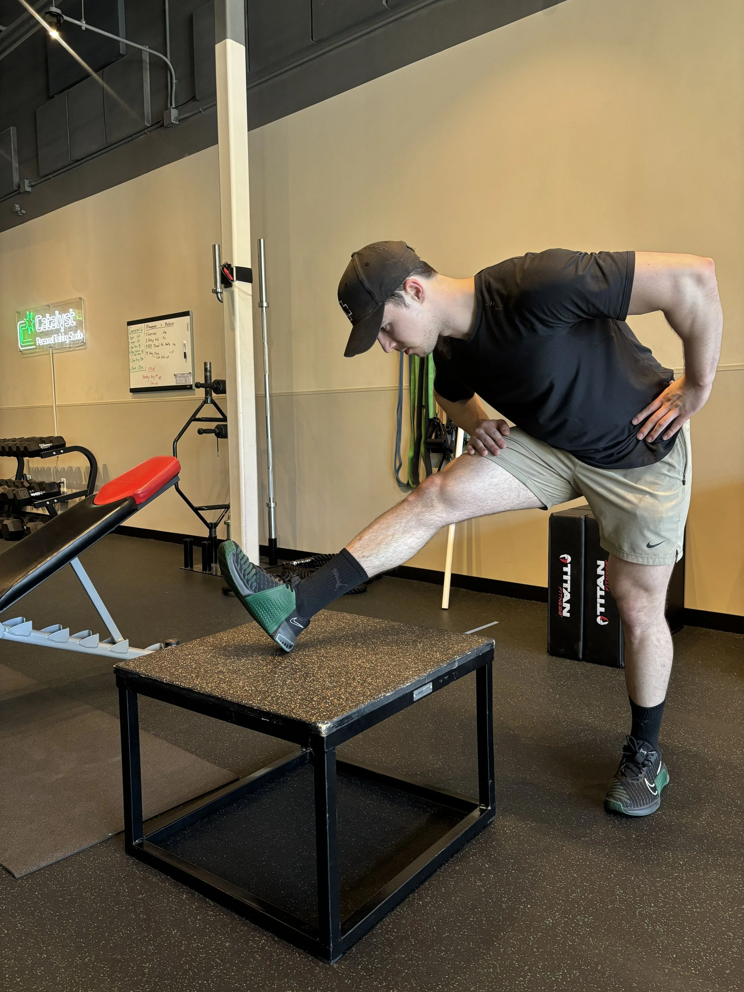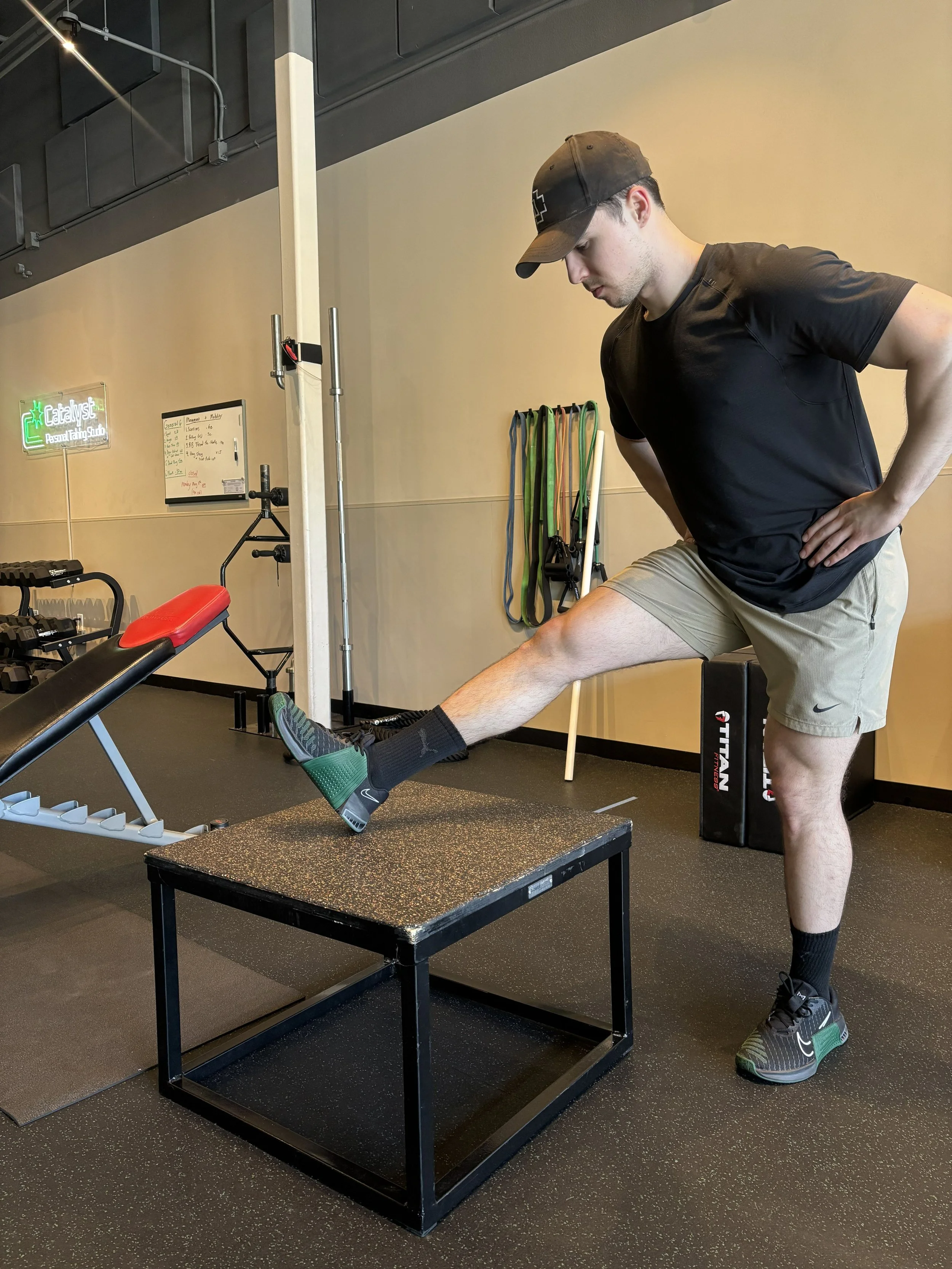 Following the initial stretch, engage the hamstrings by driving the heel down into the box for a few seconds.