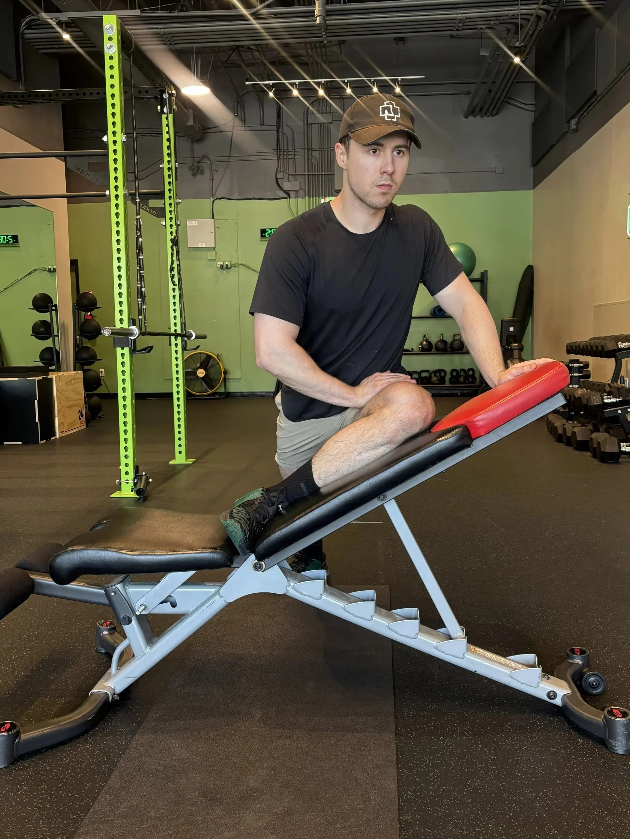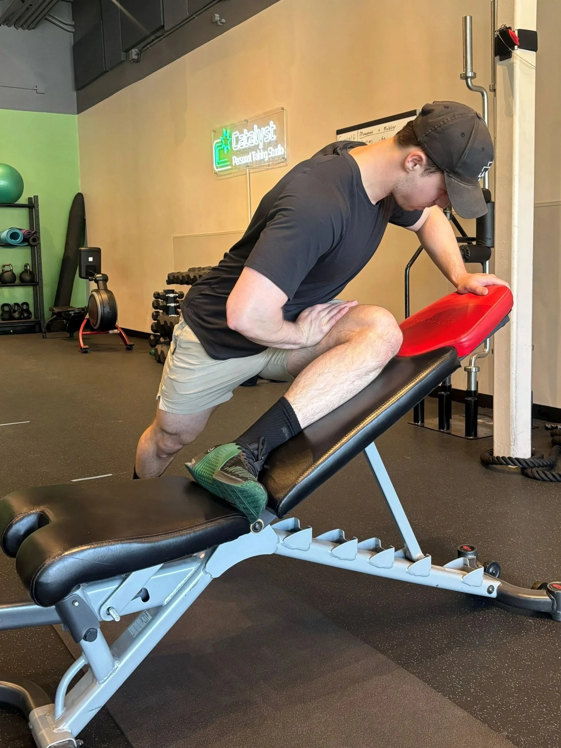 Using an angled bench, start with a fairly high angle and drape one leg across like shown. Leaning forward in this position is a great stretch for the outside of the hip. Advance the stretch by lowering the bench closer to flat.